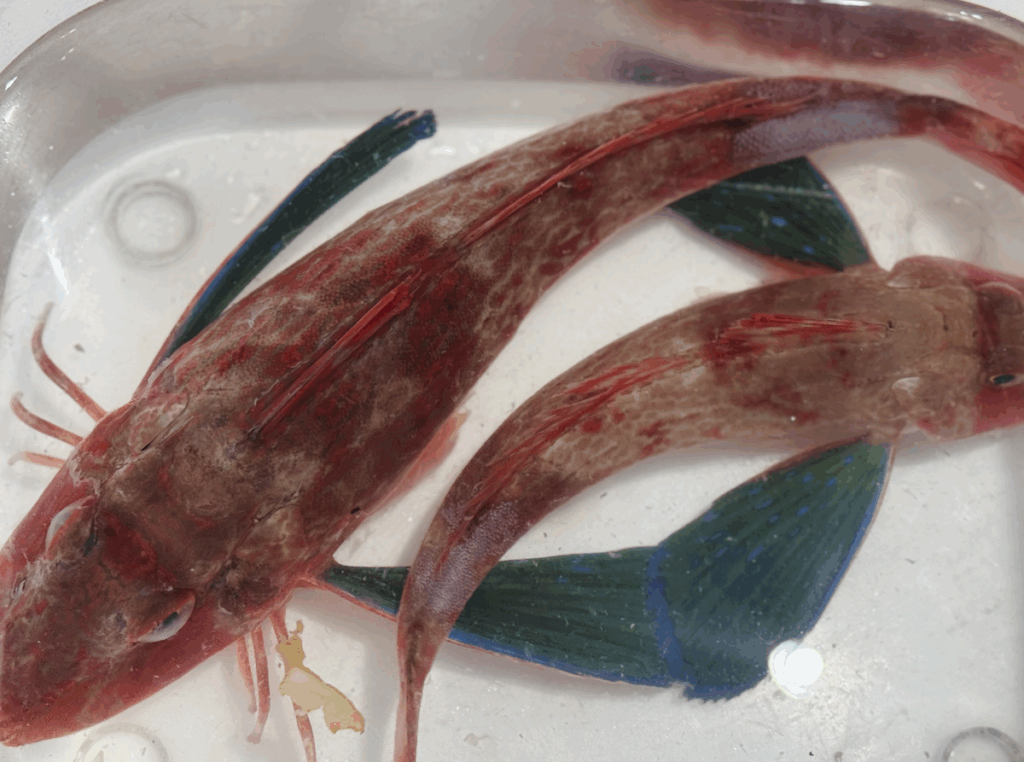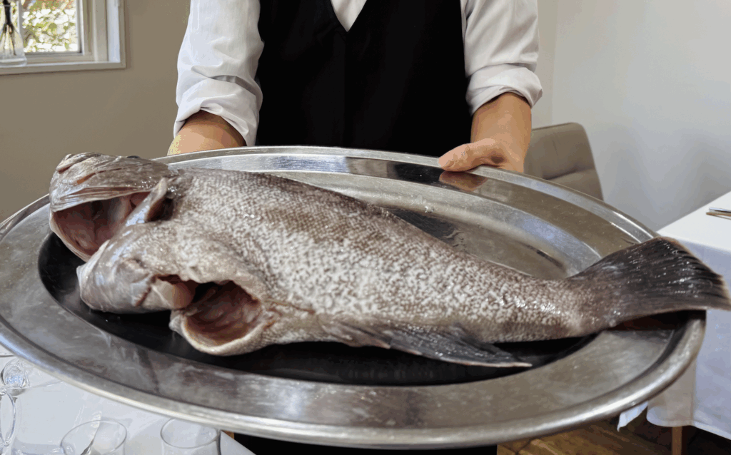 ホウボウの美しいヒレを活かした一皿。九十九里産のホウボウを神経〆しカルボーネ(炭火)とクルード(冷静)で。自家菜園育ちのカブもトロトロにして添えました。(調理前のホウボウはこちら)