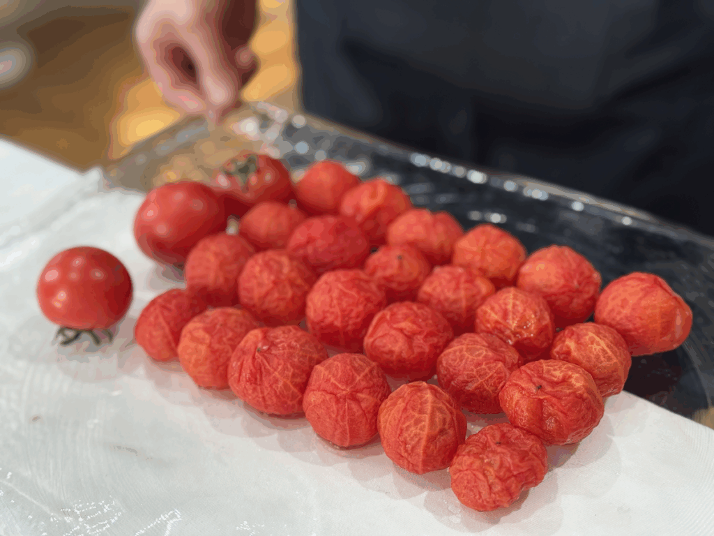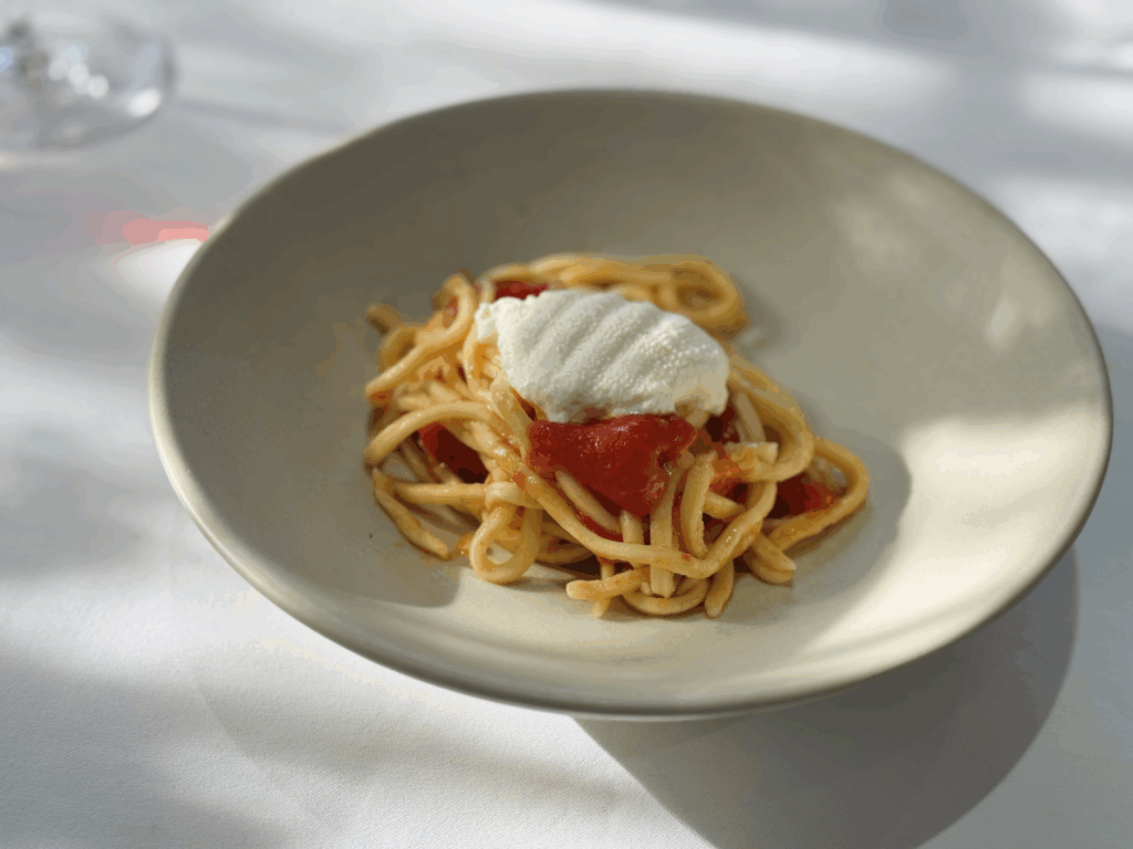 千葉県産の地粉で作ったパスタに、銚子産フルーツトマトのセミドライとリコッタチーズを組み合わせました。