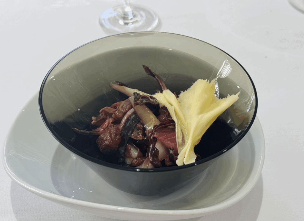 料理(1)「孟宗竹の炭火焼き 真鴨のスープ」