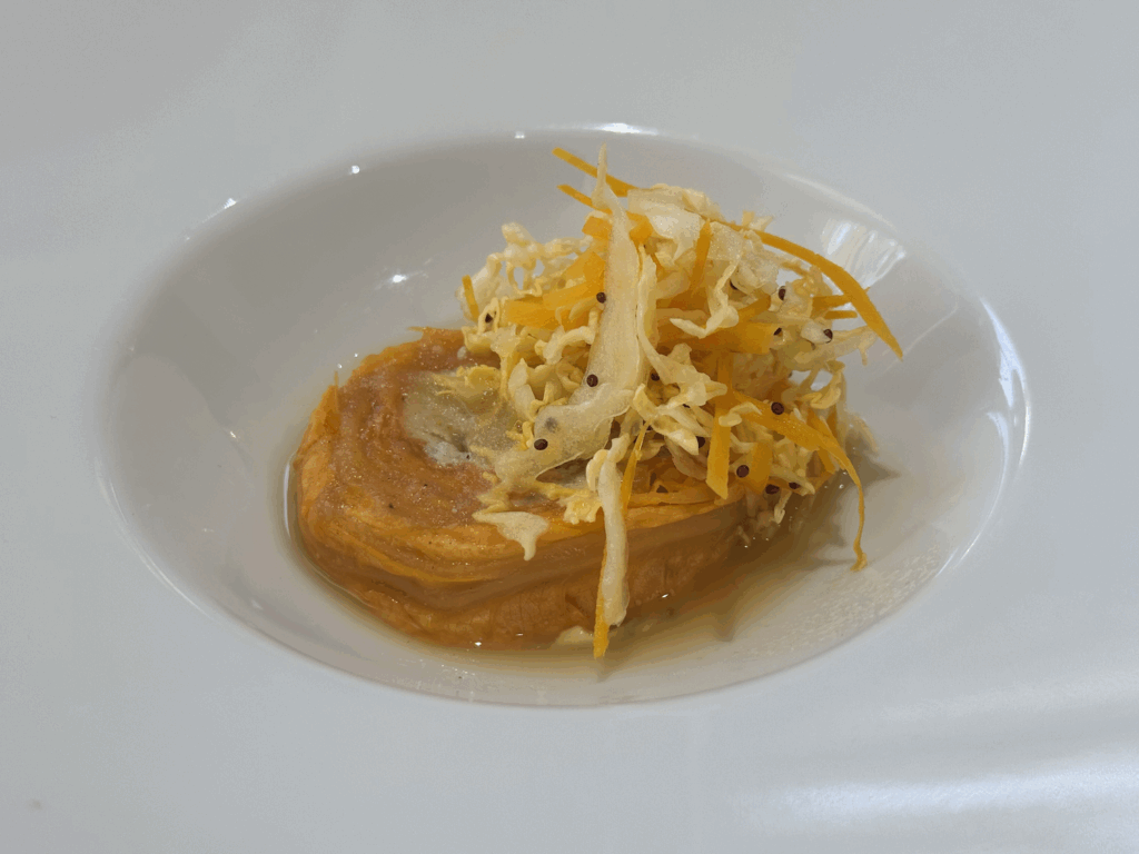 オレンジ色が鮮やかな白菜で、キジ肉が巻いた温かい一品。コリンキー(生で食べられるかぼちゃ)を添えて。ほんのりデコポンが加え、さっぱりと仕上げました。