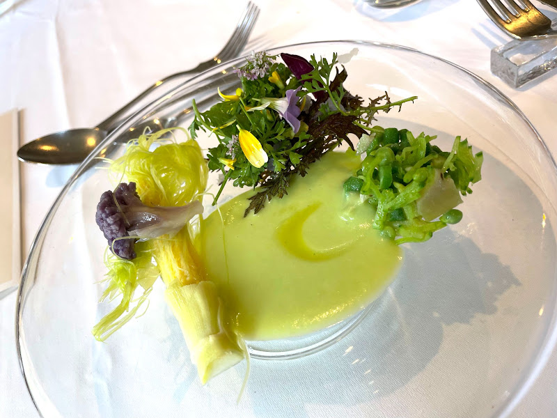 地場野菜(自家菜園のヤングコーン、紫カリフラワー、コントレノ、赤サラダからし菜、春菊の花と人参の花、インゲンとキヌサヤ、空豆のソース)