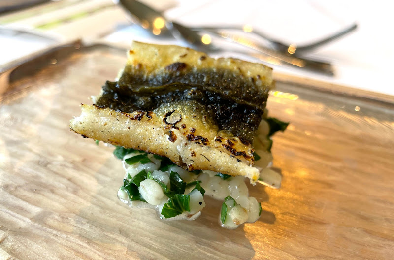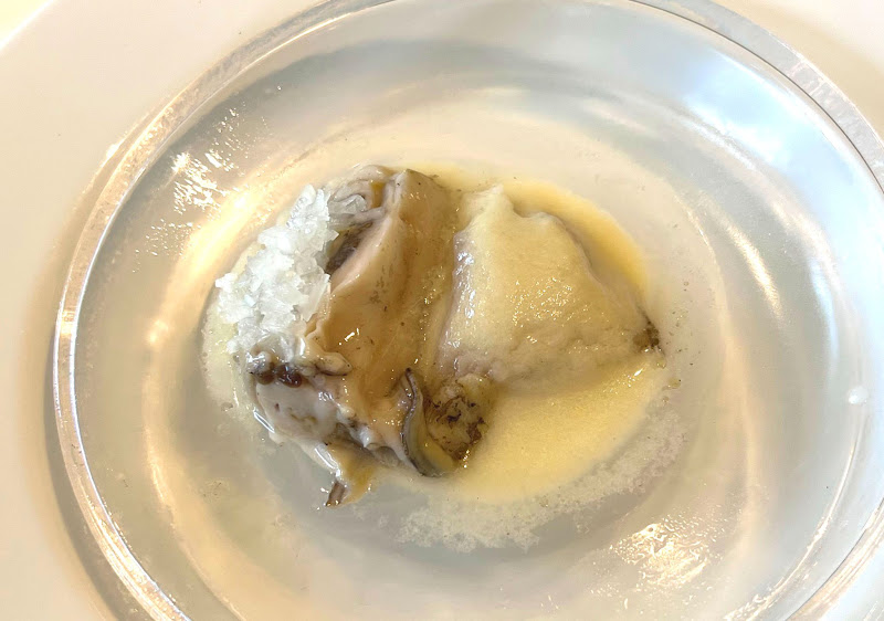 イシダイの骨の出汁をとり、オリーブオイルで乳化させたソースでいただきます。